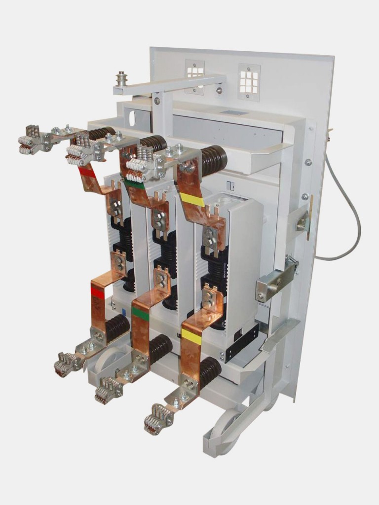 Элемент выполнен в виде выкатного модуля, который перемещается по направляющим, позволяя оперативно подключать и отключать цепи высокого напряжения без демонтажа оборудования. Корпус изготовлен из прочной стали с антикоррозийным покрытием, что обеспечивает долговечность и защиту от внешних воздействий.