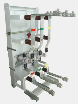 Элемент выполнен в виде выкатного модуля, который перемещается по направляющим, что позволяет быстро подключать или отключать цепи высокого напряжения без демонтажа всего оборудования. Корпус изготовлен из прочной стали с антикоррозийным покрытием, обеспечивающим долговечность и защиту от внешних воздействий.